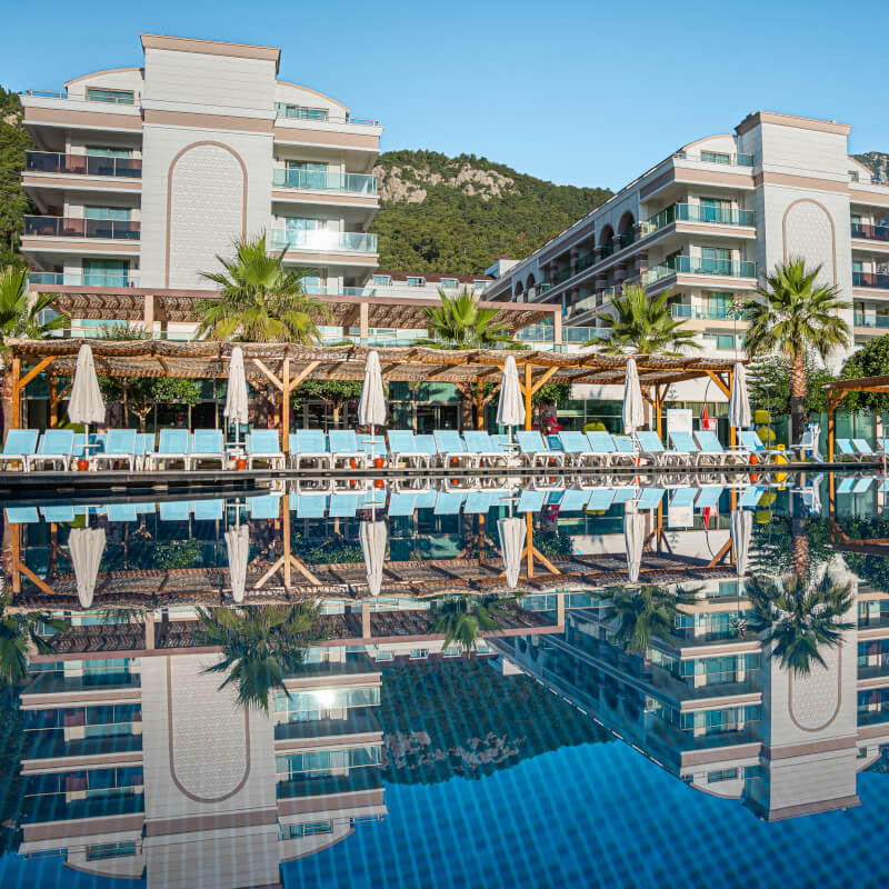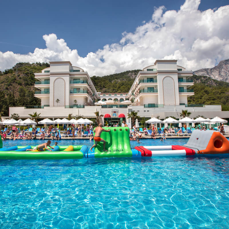 Votre hôtel L’hôtel Dosinia Luxury Resort 5* construit en 2017 sur une surface de 30 000m² est le lieu idéal pour vous divertir ou pour un séjour détente. Doté de 450 chambres, vous aimerez partir à la découverte de la région, vous adonner au farniente sur la plage privée de galets ou vous octroyer un instant de détente au spa. À votre disposition : Réception ouverte 24h/24, room service*, location de voitures*, blanchisserie*, boutiques*, photographe*, coiffeur*, médecin* (de 09h00 à 18h00), baby-sitting* (sur demande), salle de conférence, transats et matelas de plage, wifi.*Avec supplémentLes animaux ne sont pas admis au sein de l’établissement. Votre chambre Durant votre séjour, vous serez logé en chambre standard d’environ 22 m² joliment décorée. Ces chambres peuvent accueillir jusqu’à 3 personnes. Elles sont toutes équipées de : salle de bain avec douche, WC et sèche-cheveux, télévision avec chaînes satellite, téléphone*, coffre-fort, climatisation, minibar (renouvelé quotidiennement en eau et boissons soft), nécessaire à thé/café, wifi*Avec supplémentDans le cadre d'une chambre à usage triple ou quadruple, vous serez logé en chambre double équipée d'un lit double (ou de 2 lits twins) et de 1 ou 2 lits d'appoint (sofa, canapé lit).L’hôtel dispose de 3 chambres PMR (sur demande et selon disponibilité). Restaurants et bars Vous séjournerez en formule ultra tout inclus, qui comprend aussi bien les repas, boissons locales alcoolisées ou non et les snacks. Les repas seront servis sous forme de buffet, au restaurant principal de l’hôtel, qui propose des saveurs locales et internationales.Votre formule ultra tout inclus comprend :Petit-déjeuner : de 07h00 à 10h00Petit-déjeuner tardif : de 10h00 à 10h30Déjeuner : de 12h30 à 14h00Snack : de 10h30 à 21h00Pâtisserie : de 14h00 à 18h00Glaces : de 10h00 à 23h30Dîner : de 19h00 à 21h00Snack de nuit : de 21h00 à 04h00 Deux restaurants à la carte seront à votre disposition sur réservation et avec supplément :Sea food Kitchen : de 19h00 à 21h00Steak house : de 19h00 à 21h00Pour vous rafraîchir, à votre disposition également plusieurs bars :Marin bar : de 10h00 à 23h30D bar : de 10h00 à 23h30Tea and coffee corner : de 09h00 à 16h00Beach bar : de 09h00 à 19h00Coffee house : de 09h00 à 23h30Irish pub : de 21h00 à 05h00The whipet inn bar : de 21h00 à 02h00Flamingo bar : de 10h00 à 23h00Food court self service bar : de 10h30 à 18h00Night club : de minuit à 02h00À noter que la formule ultra tout inclus comprend les boissons jusqu’à 5 heures du matin. Les horaires sont donnés à titre indicatif et peuvent être soumis à modification sans préavis. Les jus de fruits frais, les boissons importées, certains cocktails mais aussi les boissons en bouteilles ne sont pas compris. Vos activités et loisirs Une équipe d’animation vous proposera une animation internationale ainsi que des spectacles le soir. Que vous soyez vacances actives ou doux moments de détente, chaque membre de la famille trouvera son bonheur parmi les nombreuses activités proposées à l’hôtel. À votre disposition : plage privée, 6 piscines extérieures dont une avec 3 toboggans, piscine intérieure, beach-volley, water-polo, step, aérobic, gymnastique, yoga, fléchettes, tennis de table, sports nautiques* (jet ski, canoë, banane), centre de spa (sauna, hammam, massages*, soins*), salle de fitness.*Avec supplémentPour les enfants : un mini club international est proposé aux enfants de 4 à 12 ans de 10h00 à 23h30 (réservation obligatoire). À leur disposition : aire de jeux de 300m², mini disco, piscine pour enfants, animations.À noter qu’au vu de la météo, certains équipements extérieurs peuvent ne pas être praticables et certaines activités annulées. Les activités, les sports et les soirées sont encadrées par une équipe d’animation internationale. Locate Situation L’hôtel Dosinia Luxury Resort 5* est à 10 kim environ du centre-ville de Kemer. L’hôtel se trouve à 45 km de l’aéroport international d’Antalya et à 35 km du centre-ville d’Antalya.