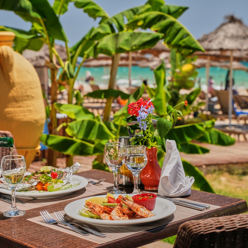 Votre hôtel Cet élégant établissement de 102 chambres, réparties dans 2 blocs indépendants, offre à ses hôtes le charme d’un style architectural arabo-mauresque et d’une décoration traditionnelle soignée. Laissez-vous envoûter par cette atmosphère intimiste aux couleurs chaudes, entouré par un personnel aux petits soins pour faire de votre séjour un véritable moment de repos et de bien-être. À votre disposition : wifi gratuit dans tout l’hôtel, téléphone/fax*, business center*, distributeur de billets, bureau de change, transats, matelas et parasols autour de la piscine et à la plage, serviettes de plage (disponible au centre spa) *, blanchisserie*, room service*.*Avec supplément Votre chambre Après plusieurs heures de soleil à la plage ou au bord de la piscine, une journée d’exploration ou une sortie en mer, le confort d’une chambre agréablement aménagée prend tout son sens ! Conçues pour vous apporter détente et bien-être, les spacieuses chambres standards aux couleurs claires sauront préserver votre tranquillité et votre intimité. La capacité maximale des chambres est de 4 personnes. Dans le cas d’une chambre à usage triple ou quadruple, l’hôtel met à votre disposition une chambre double équipée de 1 lit double (ou de 2 lits twin) et de 1 ou 2 lits d’appoints (sofa, canapé-lit). Toutes les chambres sont équipées : balcon, salle de bains avec baignoire et sèche-cheveux, climatisation (du 15/06 au 15/09), téléphone, tv satellite avec écran lcd, wifi, mini-bar (1 bouteille d’eau offerte le jour de l’arrivée), coffre-fort*.*Avec supplémentL’hôtel dispose de 2 chambres PMR (sur demande et selon disponibilités). Restaurants et bars Séjournez l’esprit libre avec la formule tout inclus, qui comprend les repas servis sous forme de buffet au restaurant principal, le Bougainvillier, où vous découvrirez des saveurs locales et internationales, ainsi que les boissons locales alcoolisées ou non et les snacks.Petit déjeuner : de 6h00 à 9h30Déjeuner : de 12h30 à 14h30Dîner : de 19h00 à 21h30À votre disposition également pour vous rafraîchir, le salon bar l’Hibiscus et le pool bar l’Orchidée de 10h00 à 23h00 (ouvert du 01/06 au 15/09).Une petite faim ? Le Royal Nozha vous proposera également une sélection de snacks maison de 16h00 à 18h00 et de 22h00 à 23h00.Au programme : crêpes, mini-pizzas, sandwichs, pâtisseries, ainsi que des glaces pour les enfants, pour le plus grand plaisir de vos papilles (ouvert du 01/06 au 15/09). Dans un esprit détendu et relaxant, le Barbecue Coco Beach vous attendra également sur la belle plage de l’établissement (ouvert du 01/06 au 15/09). En self-service, vous pourrez profiter de bières et boissons sans alcool. Il vous sera possible d’y déjeuner une fois durant votre séjour, sur réservation.À noter que la formule tout inclus comprend les boissons (servies au verre) de 10h00 à 23h00. Les horaires sont donnés à titre indicatif et peuvent être soumis à modification sans préavis de la part de l’hôtelier et ce, sans que la responsabilité de Mondial Tourisme soit engagée. Les jus de fruits frais, les boissons importées, les cocktails mais aussi les boissons en bouteille ne sont pas compris. Vos activités et loisirs Une équipe d’animation vous proposera jeux et tournois ainsi que des spectacles en soirée. Vous aurez également à votre disposition un large choix d’activités, parmi lesquelles : grande piscine extérieure adulte avec espace d’hydromassage et pataugeoire pour les enfants, plage à 200 m, tennis (1h/jour/personne, sur réservation), tennis de table, volley-ball, pétanque, bowling* « the strike » (6 pistes, sono disco), fitness (1-2h/jour/personne, sur réservation), sports nautiques*, excursions*.Un centre de remise en forme Royal Spa* sera à votre disposition, avec les prestations suivantes : sauna, massages, hammam, soins d’hydrothérapie et cures (massage sous affusion, hydro-chromothérapie, douche sous-marine), soins esthétiques et soins beauté (coiffeur, tatouage, fitness).*Avec supplémentÀ noter qu’au vu de la météo, certains équipements extérieurs peuvent ne pas être praticables et certaines activités annulées.Pour les enfants : un mini-club, avec une aire de jeux, est mis à la disposition des enfants de 4 à 12 ans. Ouvert tous les jours, de 10h à 12h et de 15h à 17h. Des animations et activités leur seront proposées en fonction de leur âge. Locate Situation Situé sur la presqu’île du cap Bon, à 70 km environ de l’aéroport de Tunis-Carthage et à 110 km de l’aéroport de Monastir. A 200 m de sa plage privée accessible par un petit chemin ombragé et fleuri.